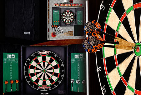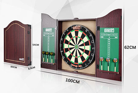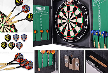 Each kit includes a professional dartboard, steel tip darts, and a stylish wooden cabinet that protects your wall and keeps everything in one place.